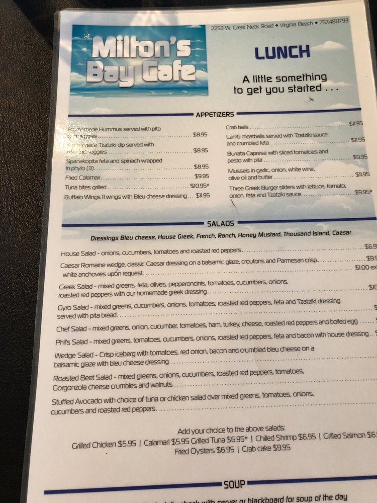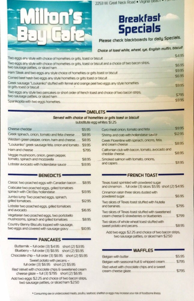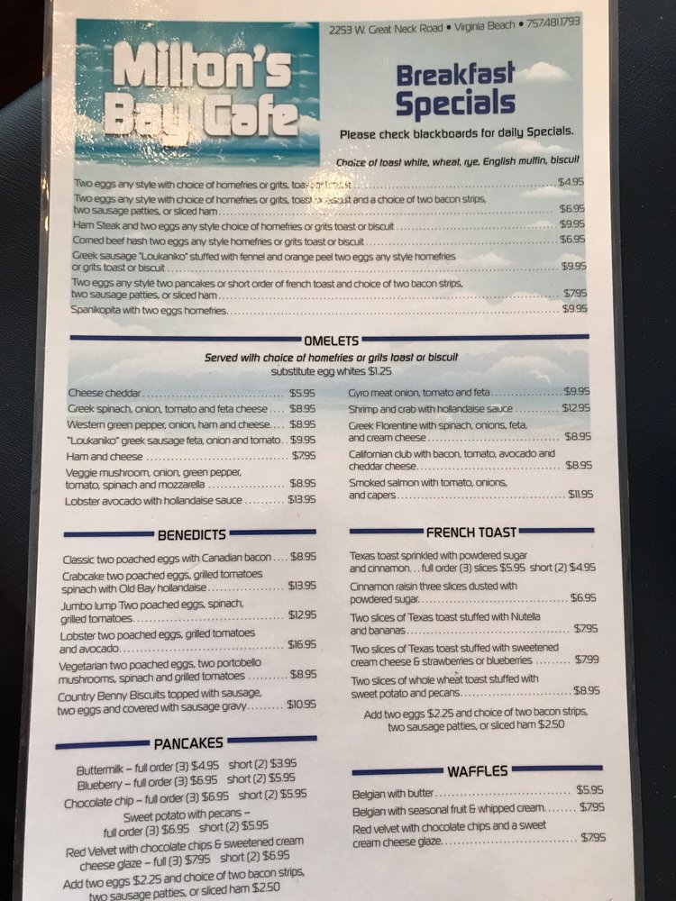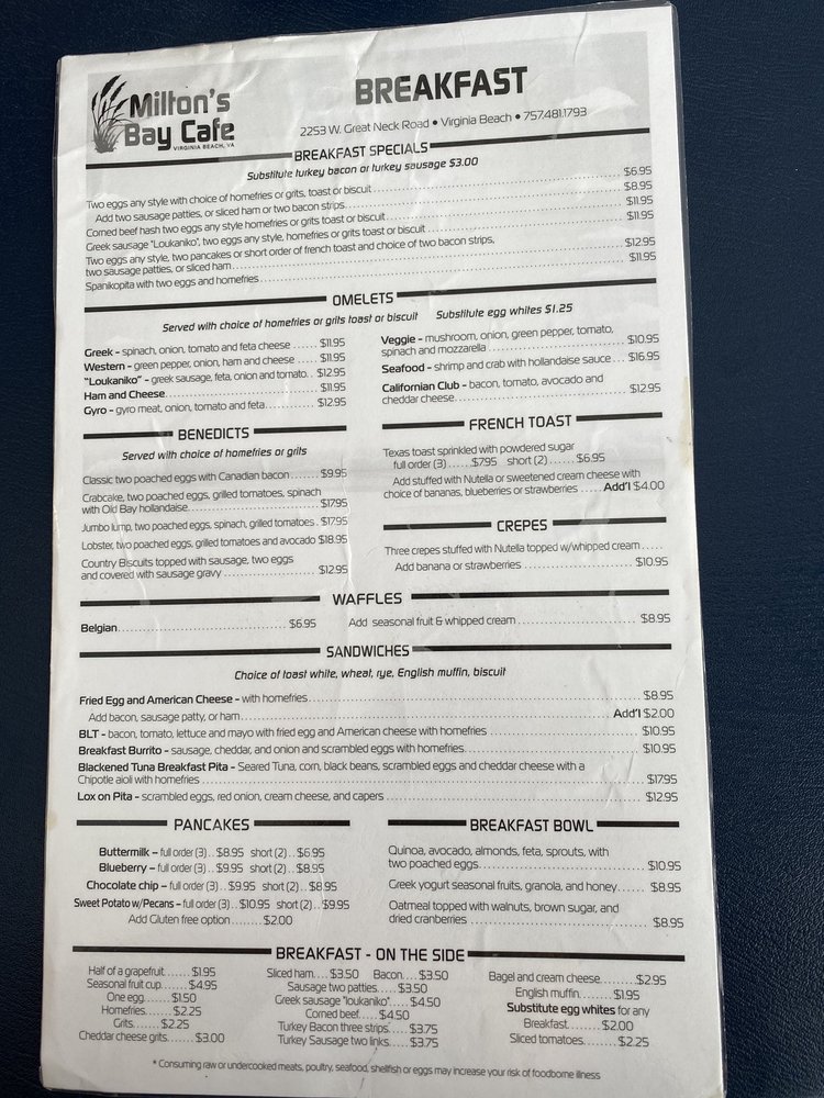 Milton’s Bay Cafe, located in Virginia Beach, offers a cozy and welcoming atmosphere, perfect for a delicious Greek-inspired breakfast or brunch. The cafe prides itself on excellent service, with owner Milton and his staff going above and beyond to ensure a top-notch dining experience. Customers rave about the diverse menu, with standout dishes like sweet potato pancakes, eggs benedict, lobster omelette, and stuffed berry French toast. The friendly and attentive service, along with the charming ambiance, make this cafe a true hidden gem. Whether you're a regular patron or a first-time visitor, Milton’s Bay Cafe promises a memorable dining experience that will keep you coming back for more.